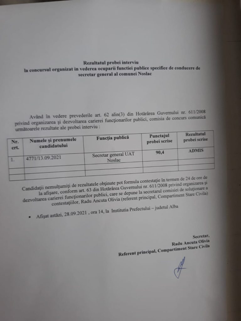 Rezultat interviu – ocupare post secretar general al comunei Noșlac